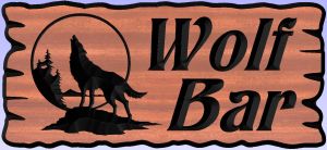 24 X 11 sign with black cuts and special (Wolf Bar) edge/shape, graphic, and 2-3 lines of text carved in Cypress (lighter) or Mahogany (darker)